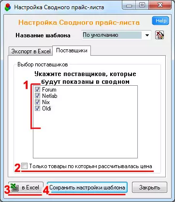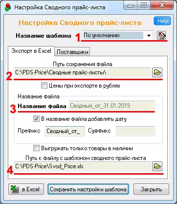 В меню: Экспорт / Экспорт данных справа от кнопки "Сформировать сводный прайс-лист" есть кнопка с настройками этого экспорта, после нажатия которой откроется форма: