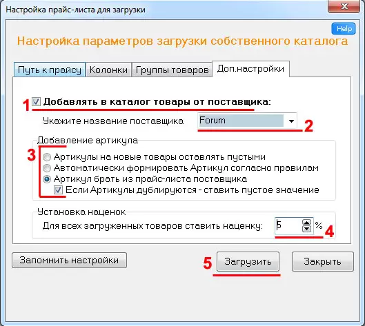 Откроется форма с настройками загрузки каталога товаров: