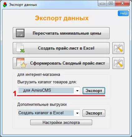 В выпадающем списке "Выгрузить каталог товаров для:" выбираем "для AmiroCMS" (если у вас другой движок интернет-магазина, выбираем выгрузку для него)