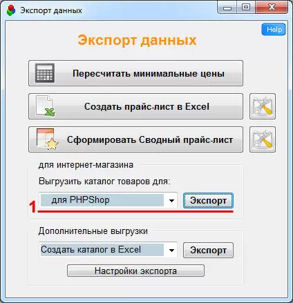 В выпадающем списке "Выгрузить каталог товаров для:" выбираем "для PHPShop" (если у вас другой движок интернет-магазина, выбираем выгрузку для него)