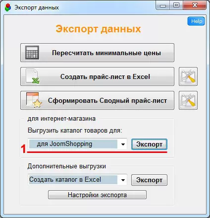 В выпадающем списке "Выгрузить каталог товаров для:" выбираем "для JoomShopping" (если у вас другой движок интернет-магазина, выбираем выгрузку для него)