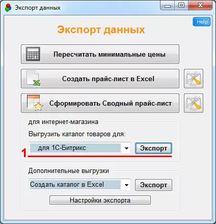 В выпадающем списке "Выгрузить каталог товаров для:" выбираем "для 1С-Битрикс" (если у вас другой движок интернет-магазина, выбираем выгрузку для него)