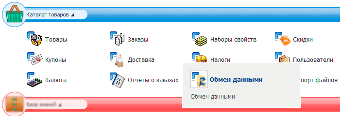 Теперь нужно зайти на сайт интернет-магазина в панель администратора. В группе Каталог товаров выбрать Обмен данными.