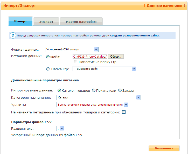 Перейти на складку Импорт, указать путь к файлу CatalogAmiroCMS.csv, который только что был создан программой PDS-Price.
