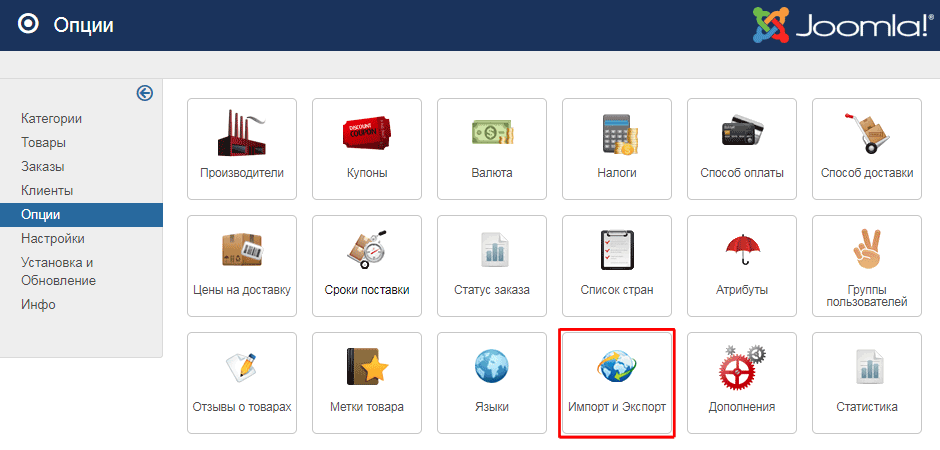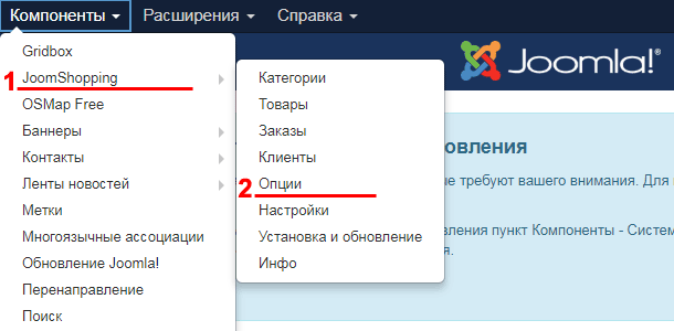 Теперь нужно зайти в панель администратора сайта, и там в меню: Компоненты зайти в меню: JoomShopping / Опции