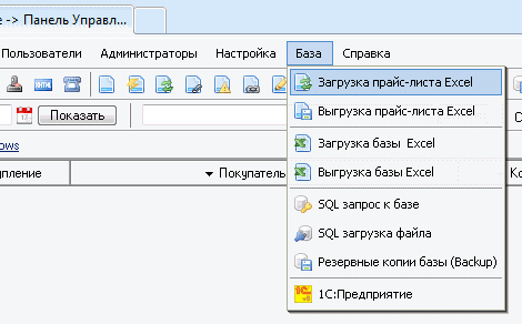 Теперь нужно зайти в панель администратора сайта, а там выбрать меню: База / Загрузка прайс-листа Excel