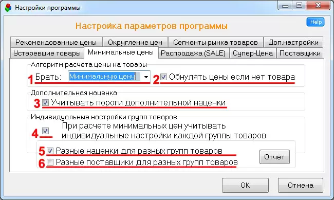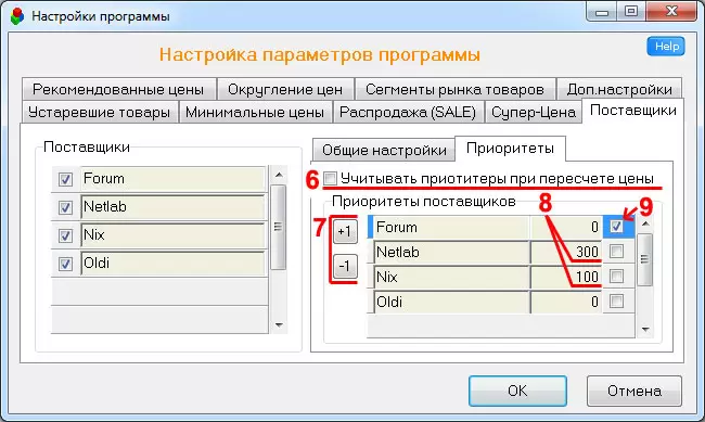 Важные галочки - это "Супер-приоритет" (9), которые позволяют указать цены какого поставщика использовать при расчете собственной цены. Эту галочку выгодно ставить для товаров, которые есть на собственном складе.