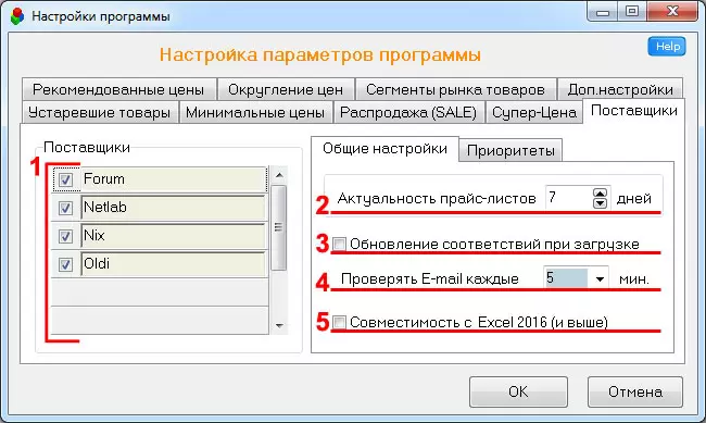 На вкладке настраиваются поставщики по которым будут пересчитываться цены, и некоторые параметры загрузки прайс-листов.