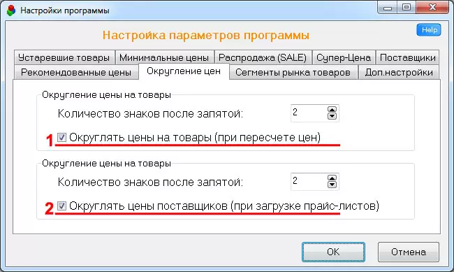 Программа позволяет округлять цены поставщиков, а также собственные товары, при пересчете цен.