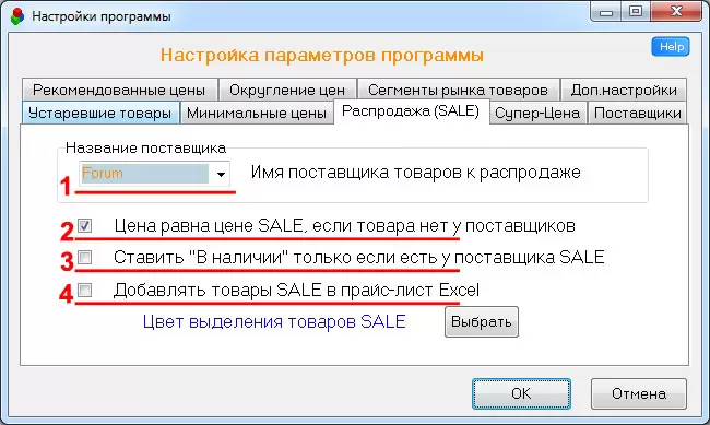 В программе есть особенные настройки для собственного склада, или точнее для файла с товарами для распродажи.