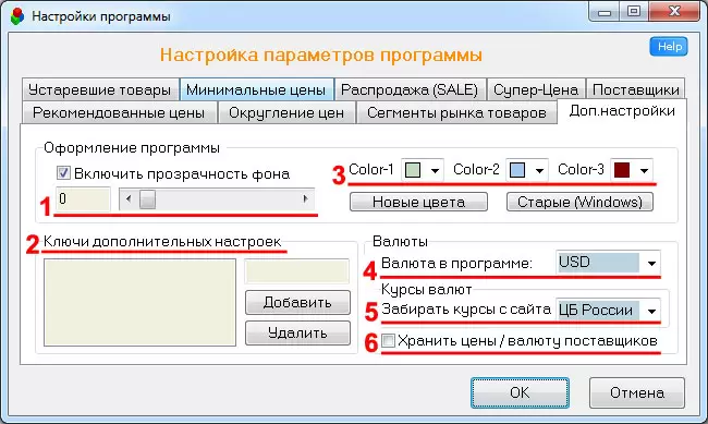 На вкладке "Доп.настройки" меняются настройки оформления, валюты, а также дополнительные ключи.
