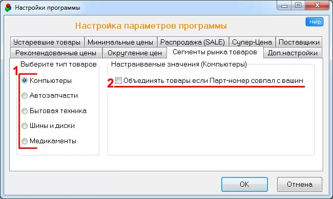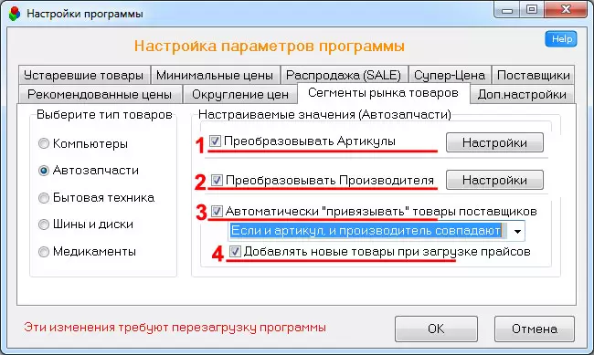 Очень много особенных настроек есть для сегмента "Автозапчастей". При выборе данного сегмента, многие блоки программы работают совершенно по другому. Но выбирать данный сегмент можно только в том случае, если вы занимаетесь именно запчастями, т.е. когда в прайс-листах ваших поставщиков есть колонки с Производителем и Кодом производителя. Тогда программа сможет практически в автоматическом режиме объединять одинаковые товары из прайс-листов ваших поставщиков.