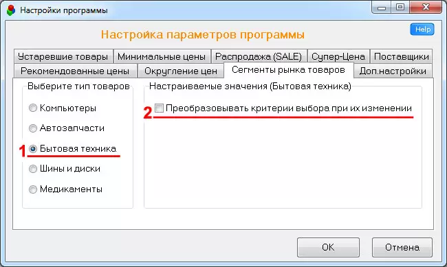 Для сегмента "Бытовая техника" тоже есть особенные настройки: возможность автоматически корректировать критерии выбора таким образом, чтобы между буквами и цифрами ставились знаки "%" (замена любых символов). Критерии с подобными настройками более корректно находят товары именно в сегменте Бытовой технике.