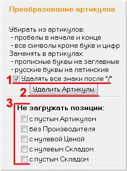 Кнопка "Настройки" откроет форму с дополнительными настройками по преобразованию Артикула, а также с настройками какие позиции не нужно загружать.